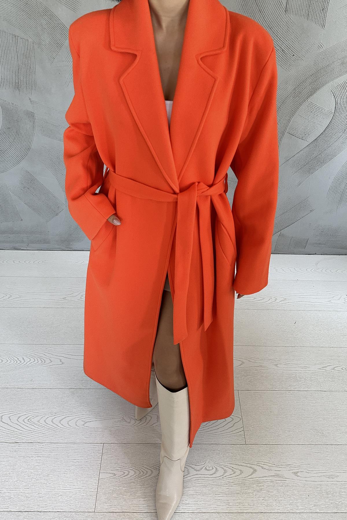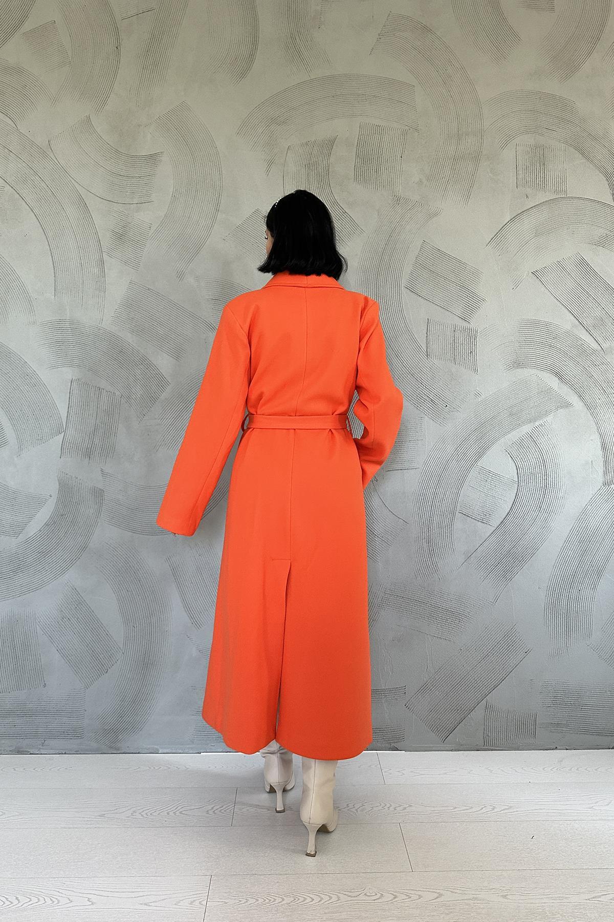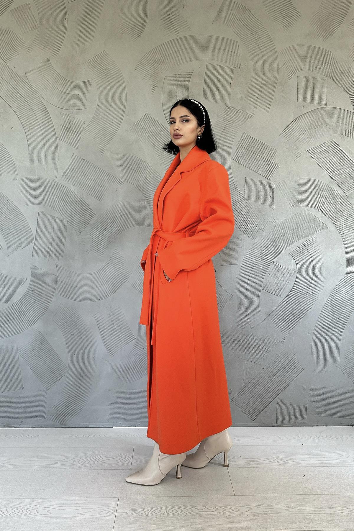 Tento dlhý kabát je presne ten kúsok, ktorý spraví dojem hneď na prvý pohľad. Sýta oranžová farba dodá outfitu energiu, no strih zostáva minimalistický a nadčasový – vďaka klopám, rovnej línii a opasku, ktorým si zvýrazníš pás. Kabát môžeš nosiť otvorený pre uvoľnený look alebo previazaný pre elegantnejší, "clean" siluetový efekt. Ideálny do mesta, do práce aj na večerné príležitosti.
