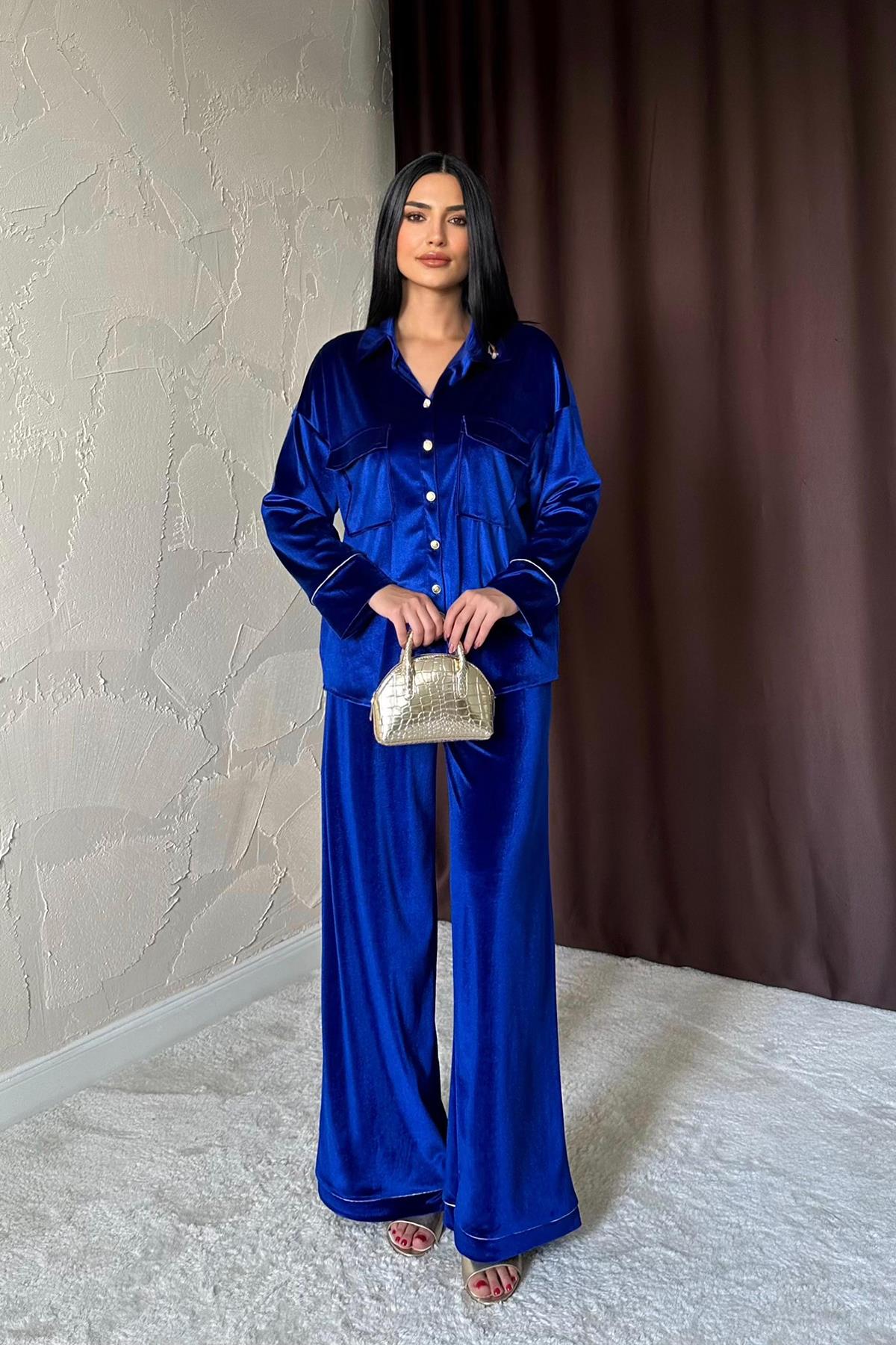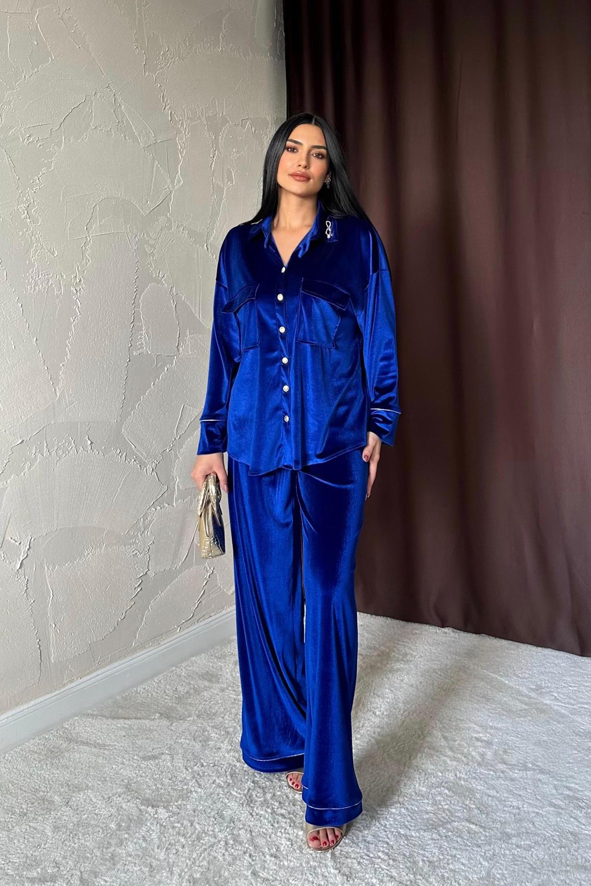 Tento set je ideálny, keď chceš vyzerať upravene a zároveň sa cítiť pohodlne. Jemne lesklý, zamatovo pôsobiaci materiál dodáva outfitu luxusný charakter, zatiaľ čo uvoľnený strih košele a široké nohavice krásne splývajú a predĺžia siluetu. Nosiť ho môžeš spolu ako výrazný "statement" outfit, alebo zvlášť – košeľu k denimu a nohavice k jednoduchému topu.